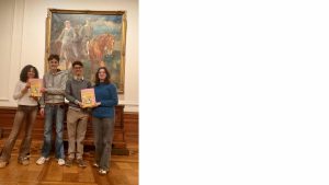 Voller Stolz schauen Esther, Luis, Malte und Svenja in die Kamera und halten ihre Praktikumsmappen in die Höhe, und der besondere Ort der Aufnahme – der