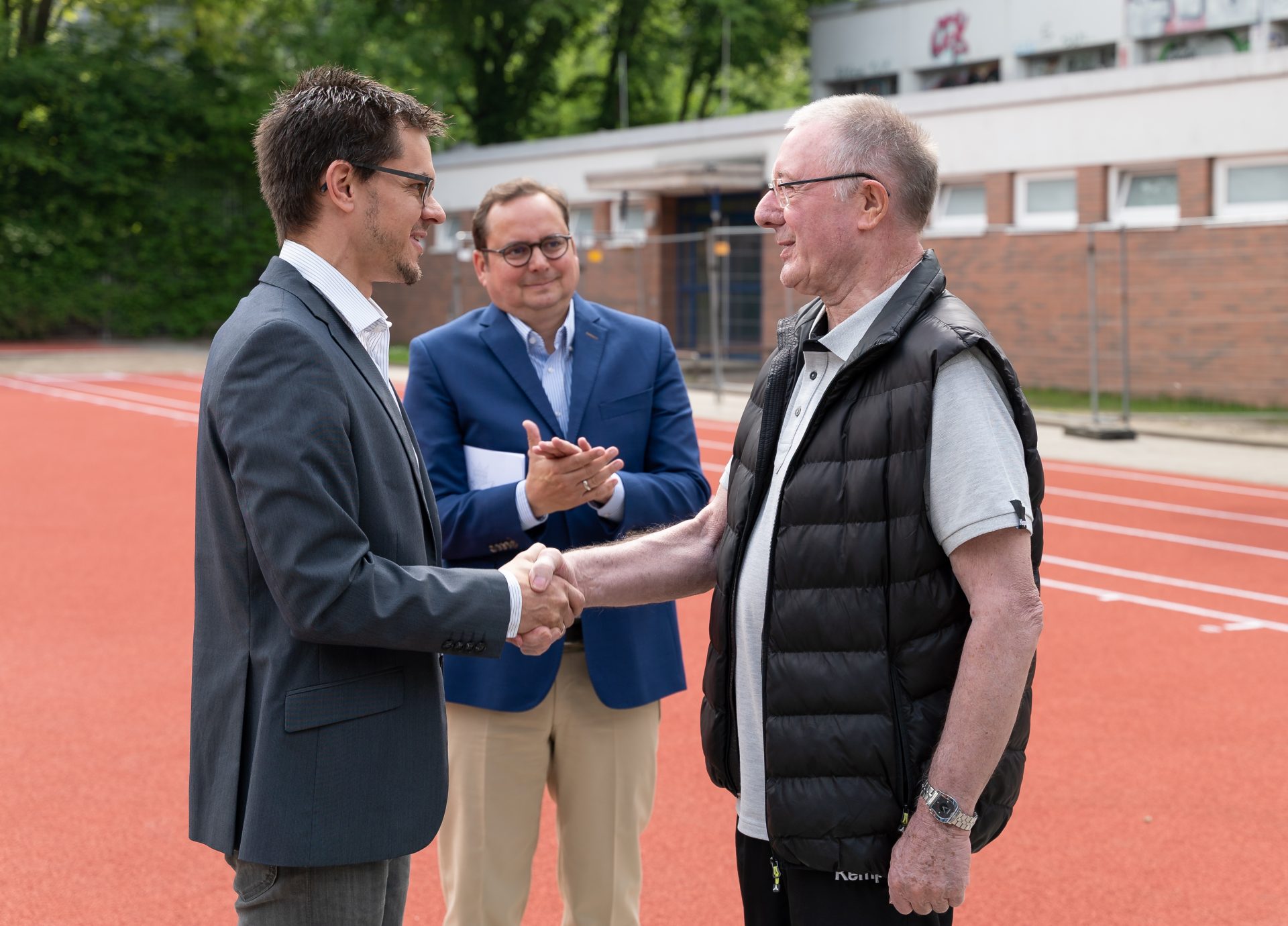Im Rahmen des Ganztagsangebots bilde der neue Sportplatz einen wichtigen Bereich für sportliche Betätigung und gemeinsames Spiel im Sinne einer lebendigen Schulgemeinschaft, so Korthaus. Fair Play – das war auch das Stichwort für Oberbürgermeister Kufen, der an die gesellschaftspolitische Verantwortung im Sport erinnert und zu Fairness, Teamgeist und gegenseitigem Respekt aufruft. Über die neue Sport- und Spielstätte freut sich auch Karl-Heinz Weißenfels, ehemaliger Lehrer des MWG, der dieses Projekt koordiniert und maßgeblich gefördert hat.