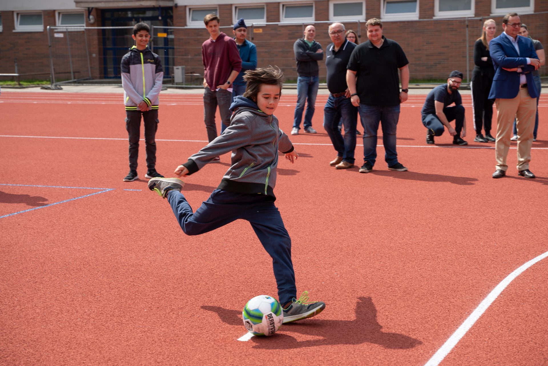 Alle Anwesenden, insbesondere die Schülerinnen und Schüler, fieberten nun der ‚praktischen‘ Eröffnung des Platzes entgegen. Herr Korthaus tauschte Sakko gegen Trikot und forderte zum Elfmeterschießen heraus, was sich Herr Kufen, Frau Rottenecker und zahlreiche Schülerinnen und Schüler nicht entgehen ließen.