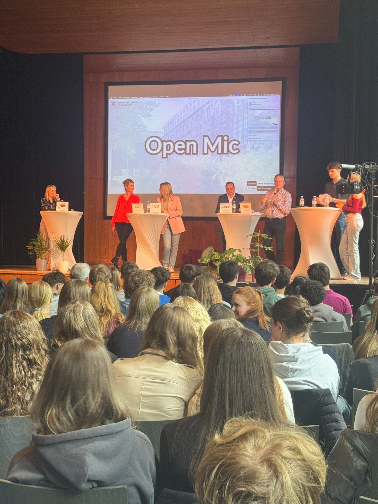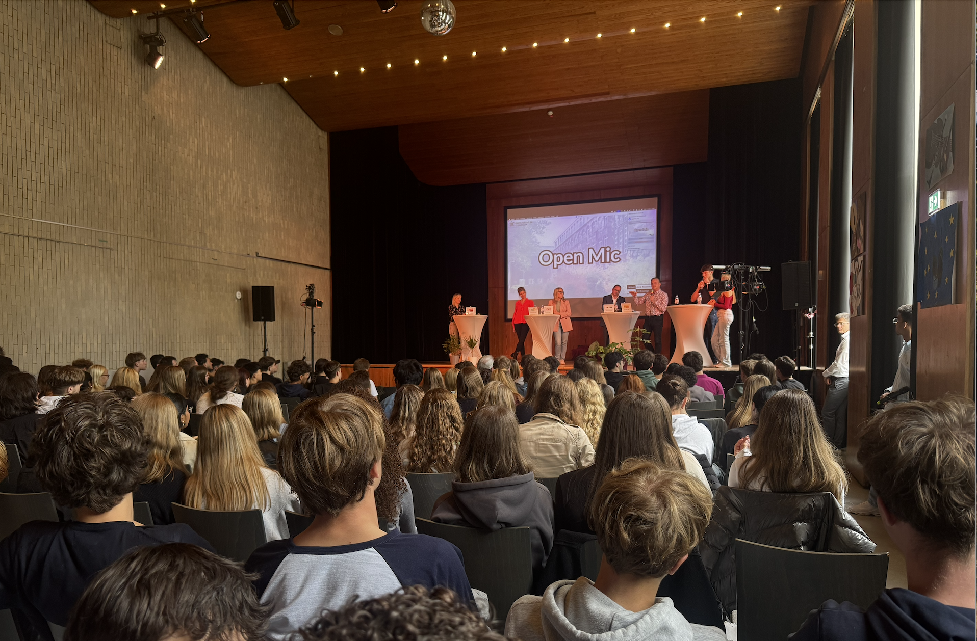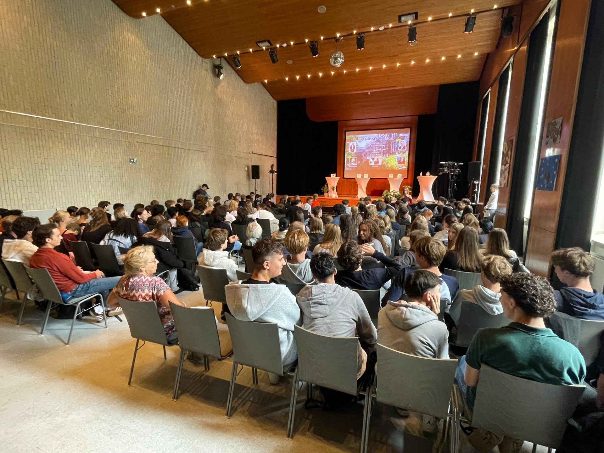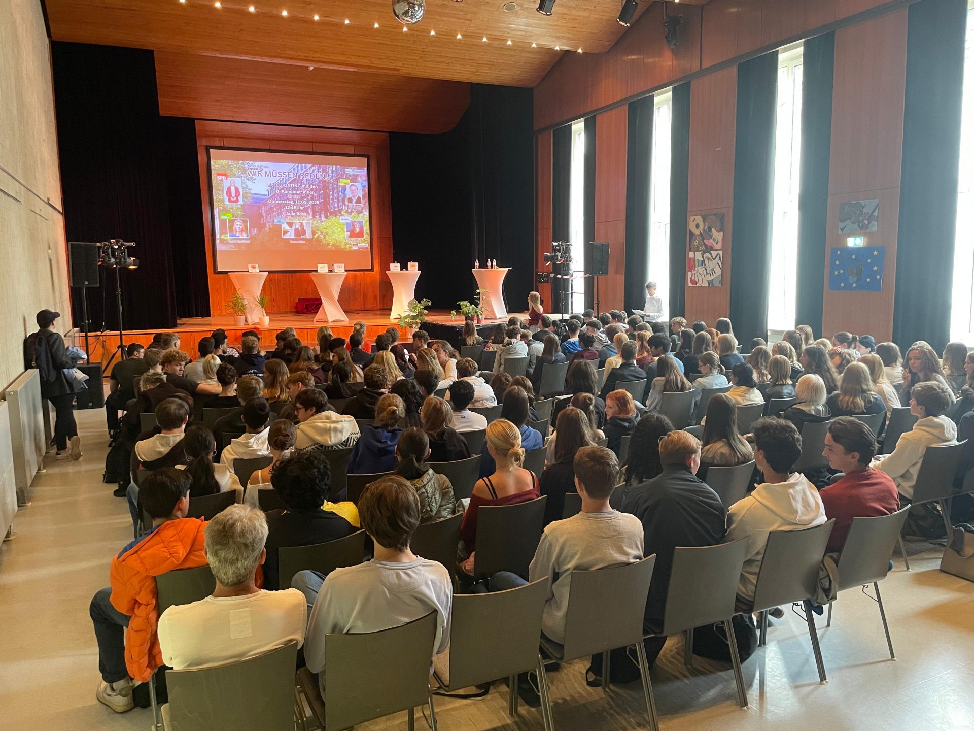 Vor vollbesetzten Reihen stellten sich die Politikerinnen und Politiker den interessierten Fragen unserer Oberstufenschülerinnen und Oberstufenschüler. Dabei ging es nicht nur um kommunalpolitische Themen, sondern auch um die großen Fragen unserer Zeit, die Jugendliche bewegen.