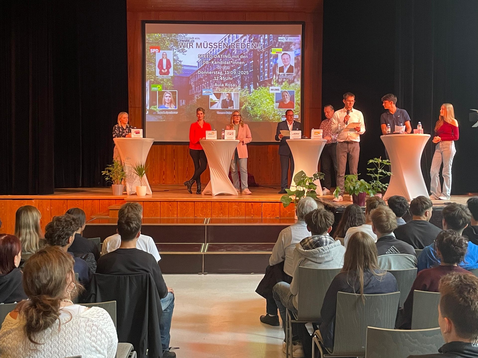 Heute haben wir in der Aula Rosa ein besonderes Highlight erlebt: eine Podiumsdiskussion mit den Kandidatinnen und Kandidaten für das Amt der Oberbürgermeisterin bzw. des Oberbürgermeisters: Julia Klewin (SPD), Thomas Kufen (CDU), Heiko Müller (FDP), Liesa Schulz (Die Linke), Inga Sponheuer (Die Grünen).