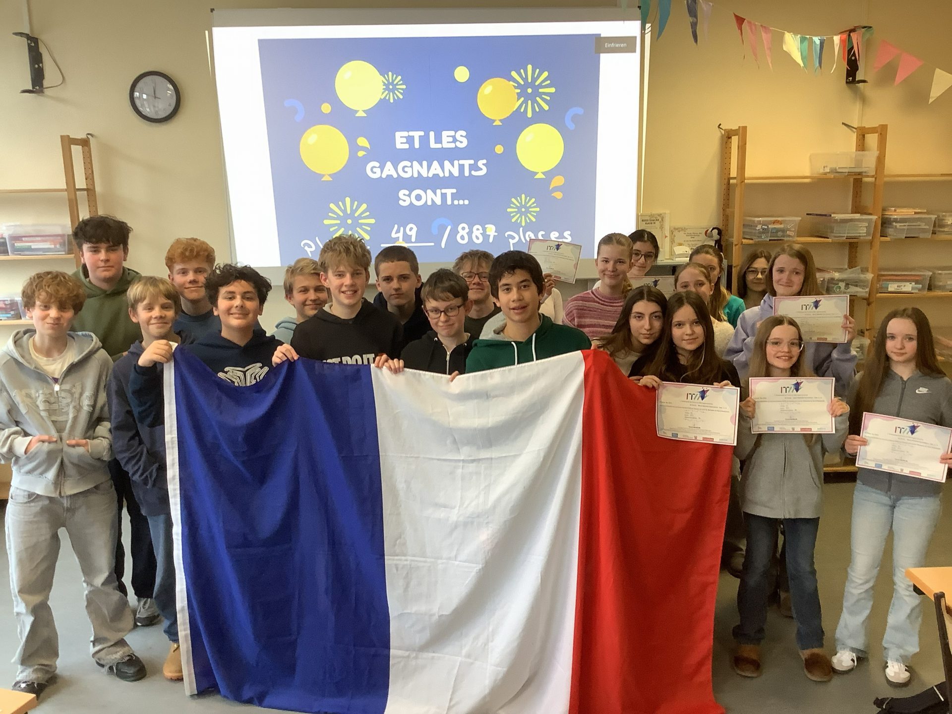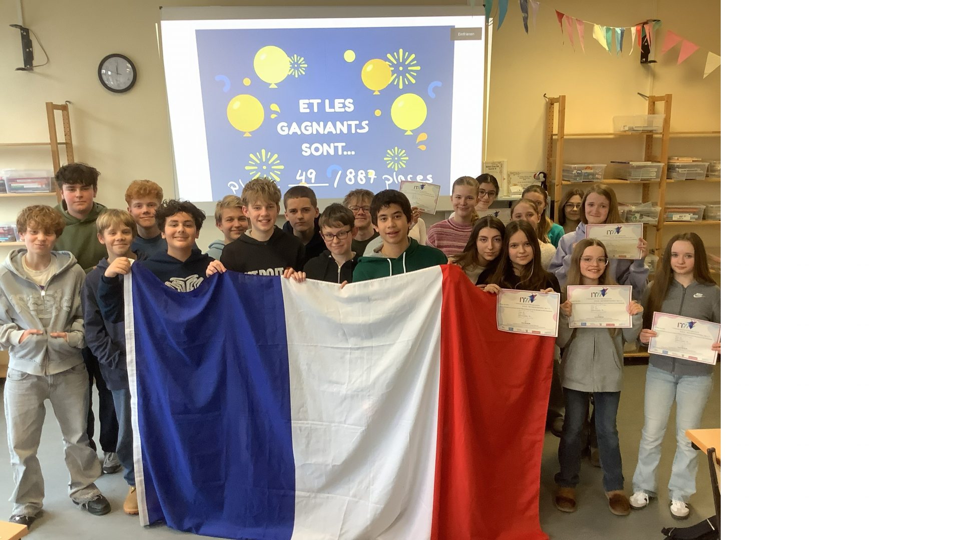 Beim Internetteamwettbewerb tauchen die Schülerinnen und Schüler in die Welt der Frankophonie und Europas ein und lösen gemeinsam knifflige Aufgaben aus den Themengebieten Sport, Geschichte, Kultur, Engagement, Allgemeinwissen und natürlich französische Sprache. In diesem Jahr hat sich der Kurs an das Niveau F2 gewagt, in dem die Fragen immer schwieriger werden und überwiegend auf Französisch gestellt sind. Daher sind alle besonders stolz auf diese tolle Leistung!