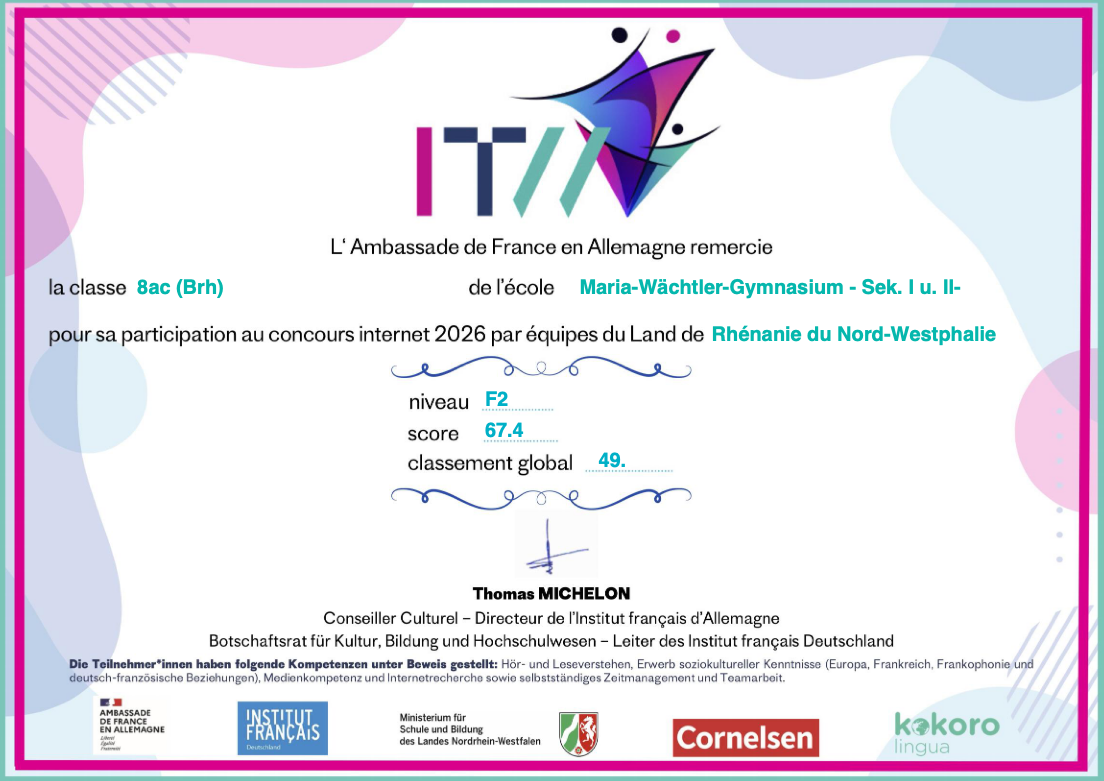 Nach einer besonderen Leistung im letzten Jahr hat der Französischkurs der Klassen 8a und 8c beim Internetteamwettbewerb erneut eine tolle Leistung gezeigt. Im Land NRW erzielten die Schülerinnen und Schüler den hervorragenden 49. Platz im Niveau F2. Insgesamt nahmen in diesem Niveau 887 verschiedene Klassen teil.
